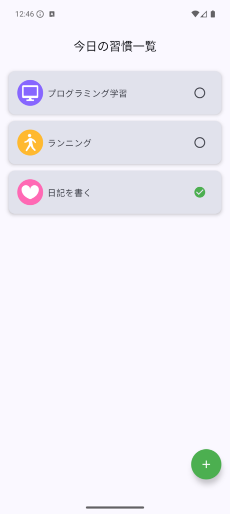 この画面では、各習慣のタイトル、カテゴリアイコン、チェックボタンを表示し、進捗を簡単に管理できるUIを目指しました。