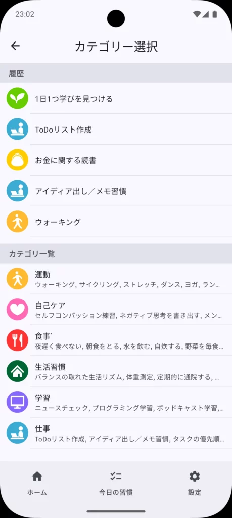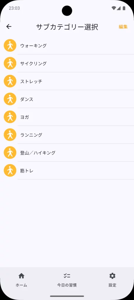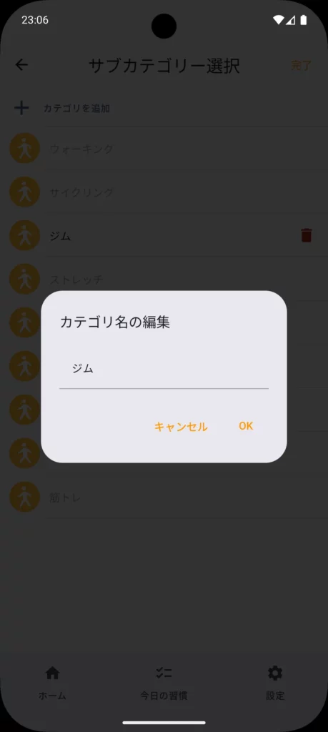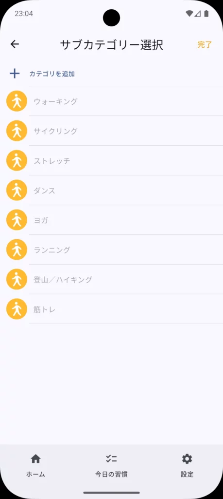 サブカテゴリー選択画面では、マスターデータを一部用意しつつ、ユーザー作成データとして以下の操作を可能にしています。